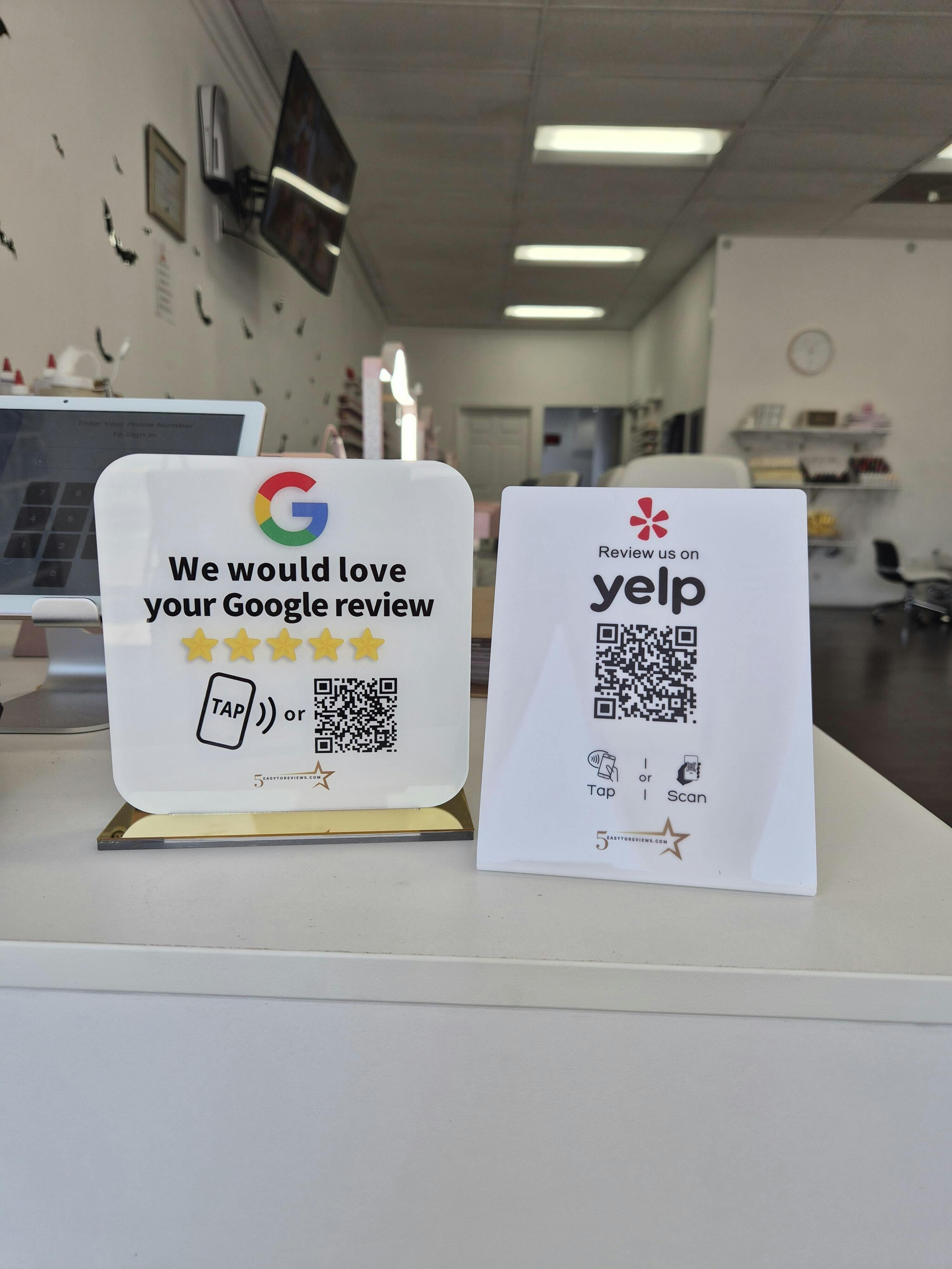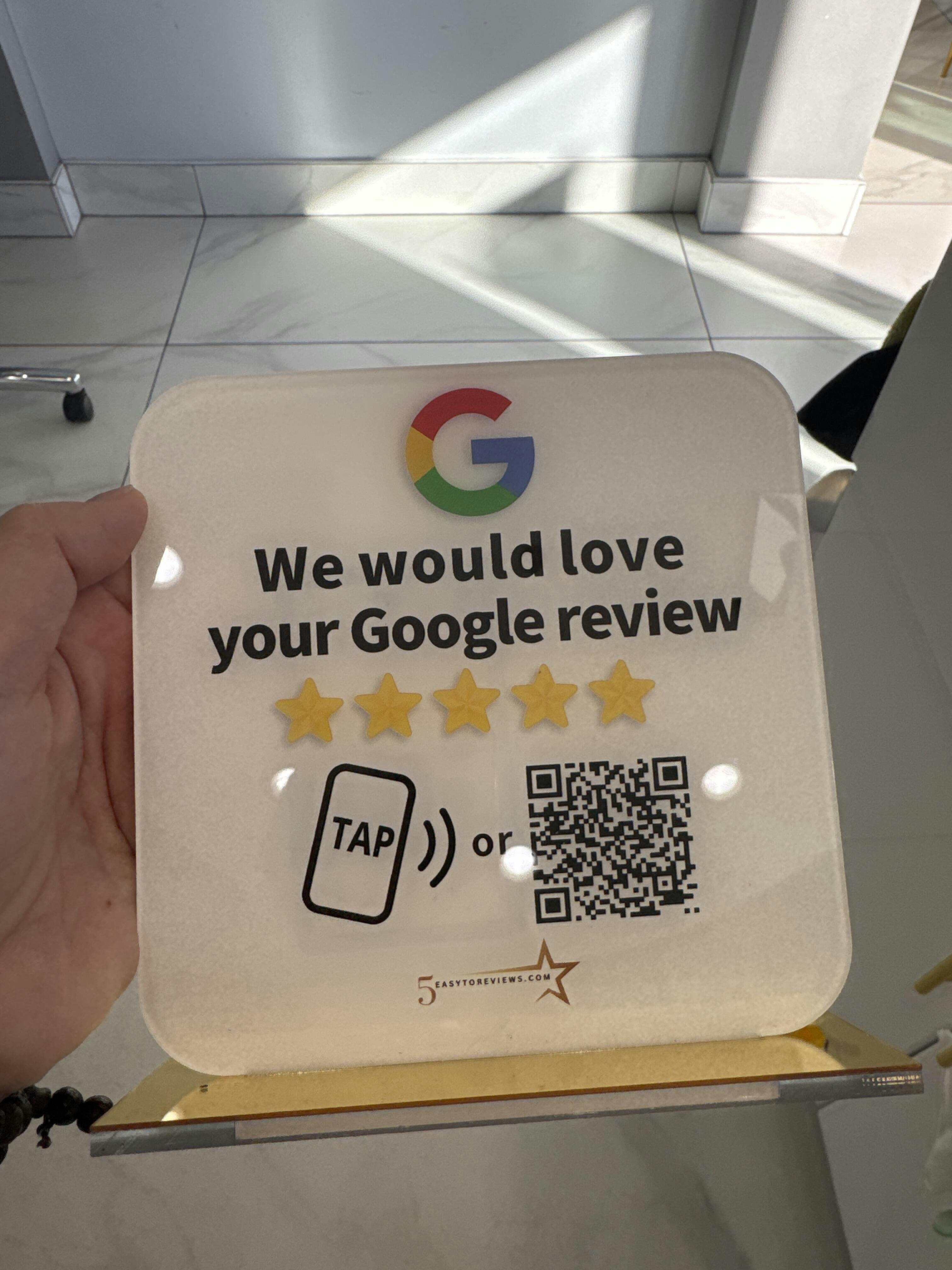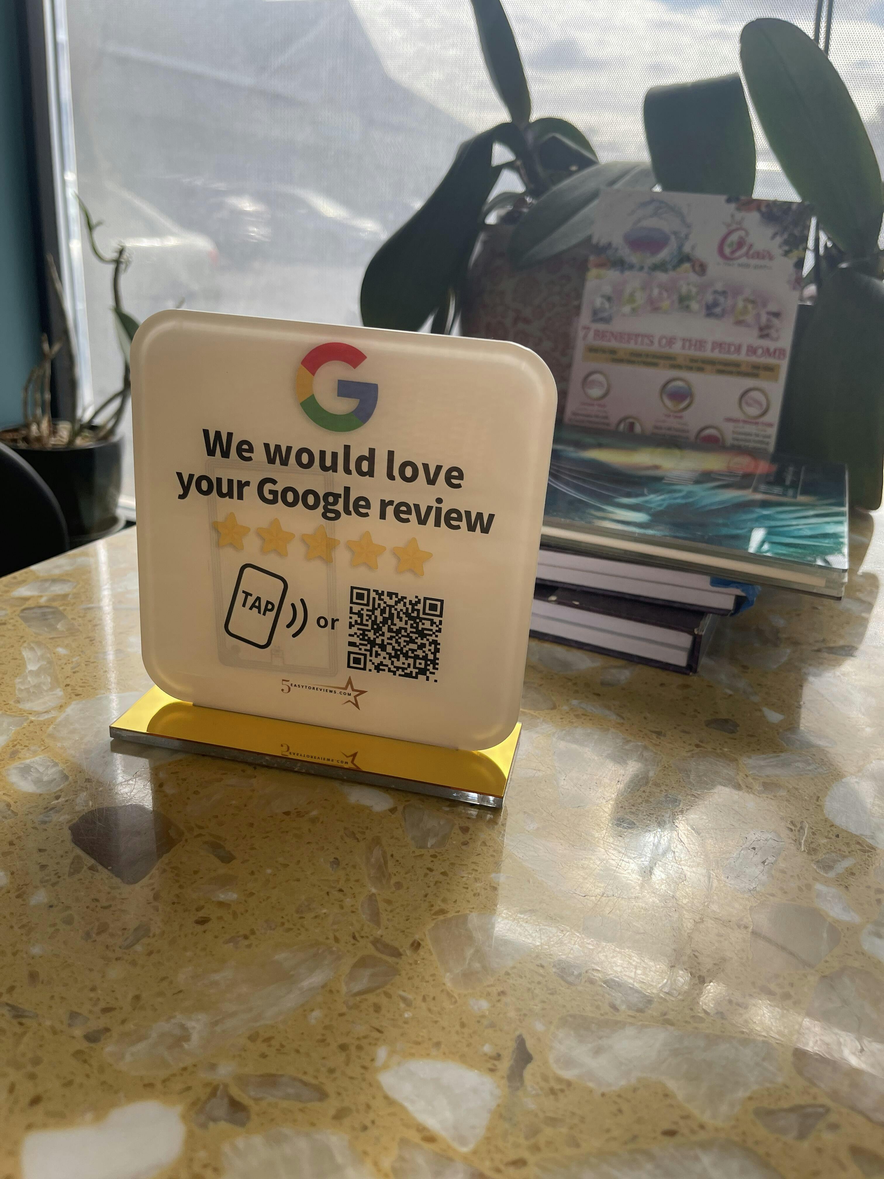 The Google Review Stand is a touch-free display designed to encourage customers to leave reviews right at the business location. With an eye-catching design and a clear call-to-action, it invites customers to rate the business on Google. Using NFC (Near Field Communication) technology, it makes leaving a review as simple as tapping a phone or scanning a QR code, so customers can quickly and easily share their feedback.
